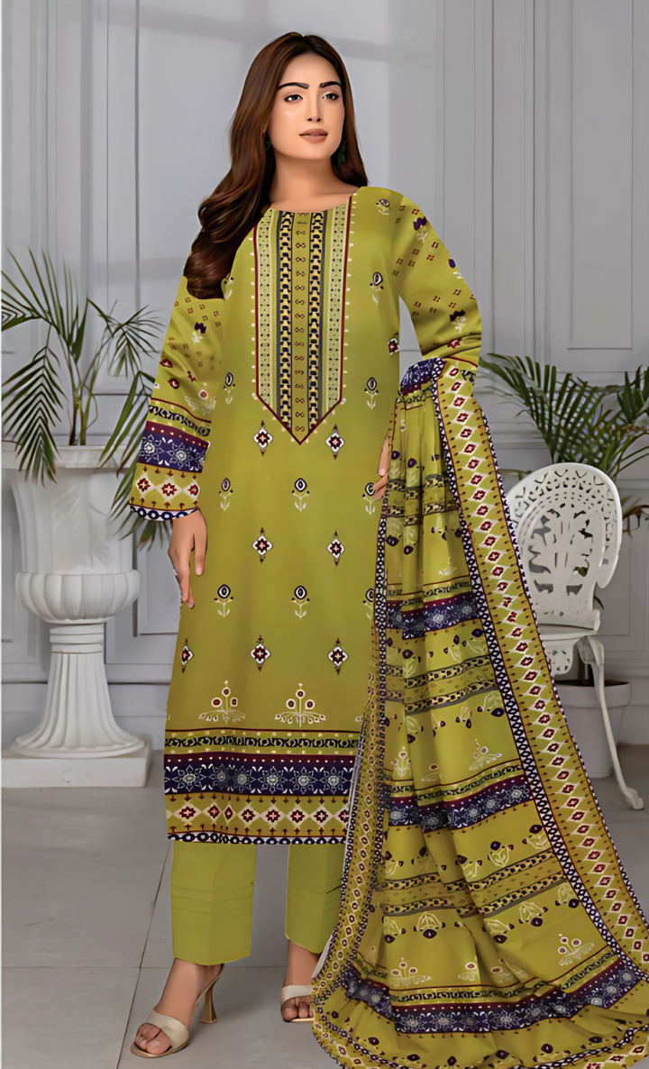 Step into refined elegance with our Olive Charm Green & Navy Lawn 3PC. The soft olive-green base is decorated with delicate geometric and floral motifs, enhanced with navy and maroon accents for a stylish ethnic appeal. The neckline features intricate embroidery-inspired detailing, while the borders and sleeves carry contrasting prints for a graceful finish. The dupatta, in a matching olive tone with bold navy patterns, adds harmony and sophistication to the entire ensemble. Dyed olive trousers complete the look with a balanced touch of simplicity.
