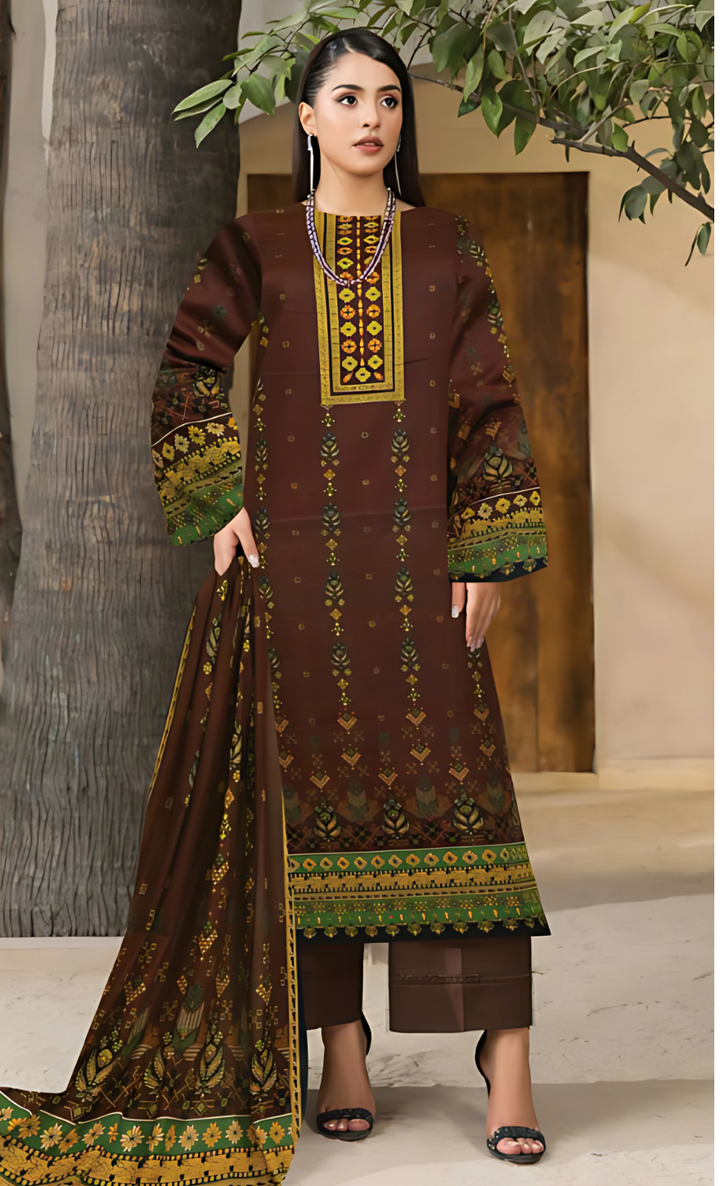 Channel timeless elegance with our Earthy Majesty – Brown & Mustard Lawn 3PC. The deep brown shirt is beautifully adorned with mustard and green ethnic motifs, giving it a warm, regal look. The neckline features bold geometric detailing, while the sleeves and borders carry intricate patterns for a rich finish. The dupatta, in a coordinated mix of brown and mustard with leafy designs, adds sophistication and harmony to the outfit. Paired with plain brown trousers, the ensemble offers a graceful yet grounded appeal.