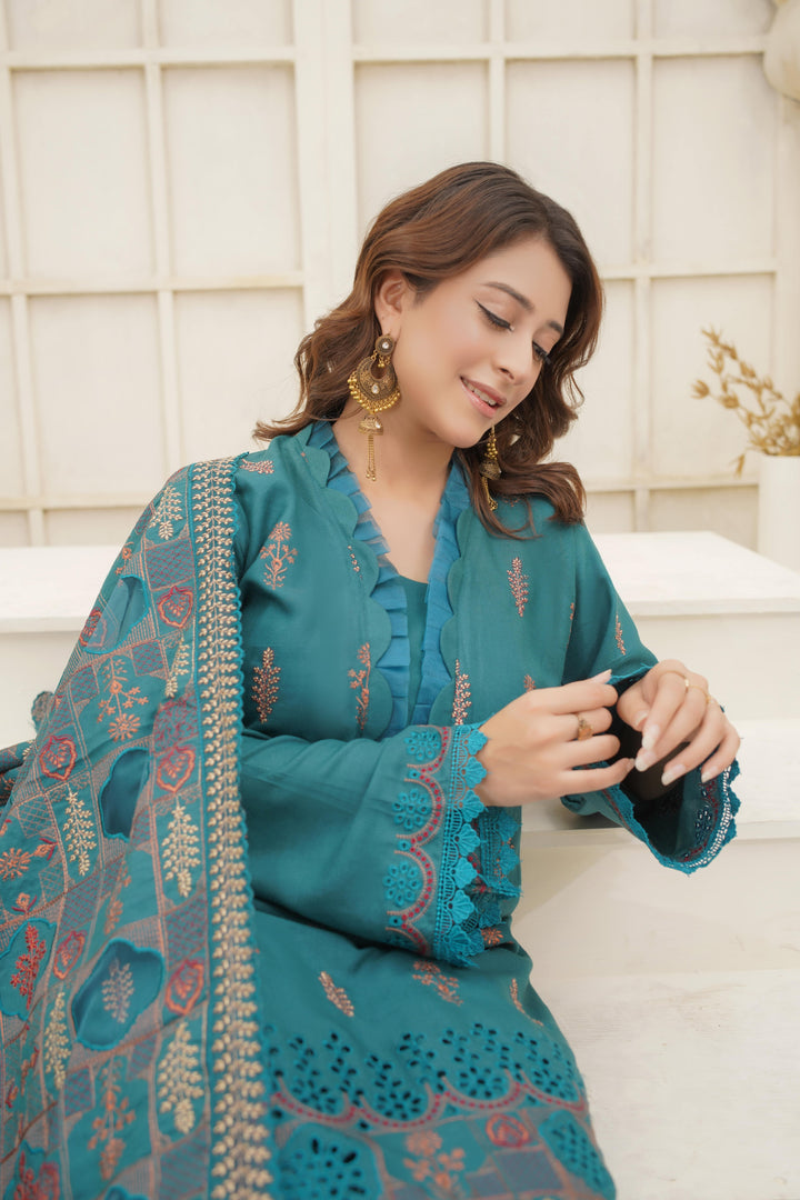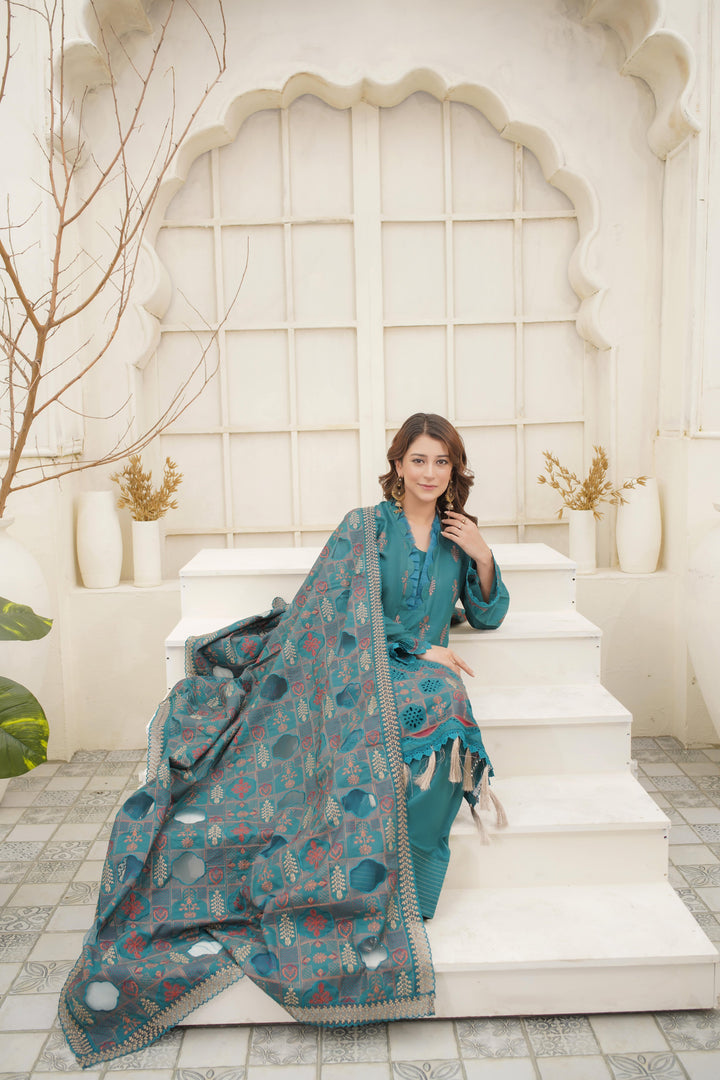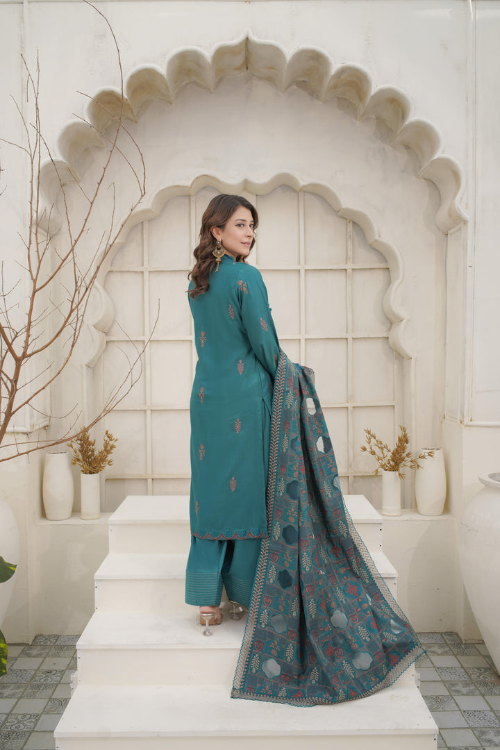 Embrace the beauty of serene elegance with our 4pc Embroidered Dhanak – Teal & Coral Grace. The rich teal base is beautifully adorned with delicate coral-colored embroidery, creating a refreshing yet sophisticated look. The shirt features intricate detailing, while the matching dupatta is designed with similar elegant embroidery, adding a refined touch. The trousers complement the ensemble, completing the look with grace.